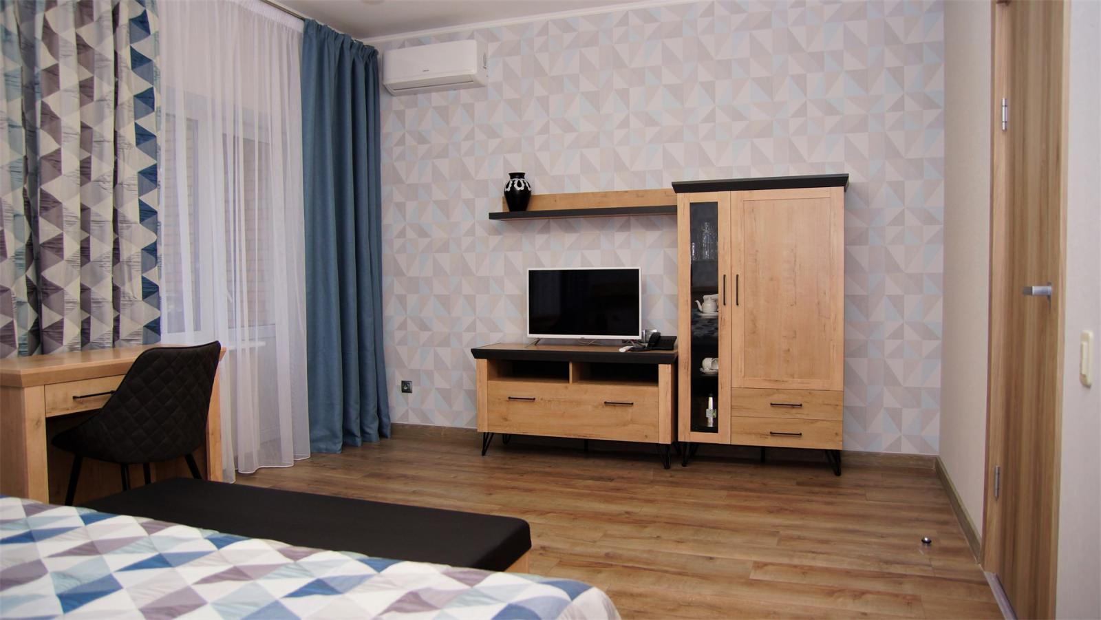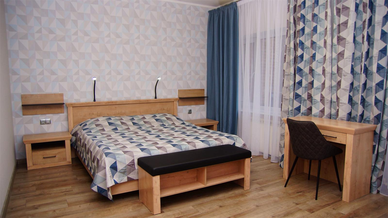 Улучшенный номер, с широкой двухспальной кроватью. Площадь номера 35 кв.м. Рассчитан на комфортное пребывание 1-2 гостей. В номере: телевизор ванная комната двуспальная кровать 180*200 холодильник шкаф для одежды балкон набор посуды эл.чайник телефон письменный стол фен
